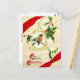 Hermoso y vintage ilustracion navideño de un pájaro colorido sobre una campana, colgado de una cinta roja, decorado con bayas azules y rojas.