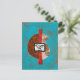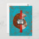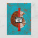 Ilustracion de pájaro divertido sobre una forma de color marrón y beige con un centro de caída naranja - todo sobre un fondo turquesa y naranja texturado.