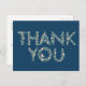 Esta moderna tarjeta de agradecimiento presenta un gráfico floral de la palabra Gracias con un pájaro posado dentro de la O. Se puede personalizar con un mensaje y nombres. La paleta de colores es rosa, lavanda y verde sobre un fondo azul marino. El texto del reverso se puede personalizar o eliminar para notas manuscritas. Coordina con la Colección de Boda Love Birds & Letters.