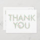 Esta moderna tarjeta de agradecimiento cuenta con un gráfico floral de la palabra Gracias con un pájaro posado dentro de la O. Se puede personalizar con un mensaje y nombres. La paleta de colores es rosa, lavanda y verde. El texto del reverso se puede personalizar o eliminar para notas manuscritas. Coordina con la colección de bodas Love Birds & Letters.