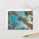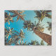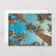 Esta foto muestra una foto hacia arriba de palmeras contra un cielo azul.