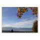 Hojas apuestas de otoño antes de cielos azules y un panorama de montaña son en este postal.