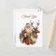 Tarjeta de agradecimiento con una divertida ilustración navideña. Papá Noel con su traje rojo tradicional montando un reno con grandes cuernos decorado con acebo. Un árbol de Navidad en la parte trasera.