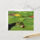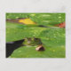 Esta postal muestra una rana verde mirando al fotógrafo desde debajo de sus colchonetas de lirio. Acaba de dejar de llover. El sol se refleja en las gotas de agua. El tamaño de unas pocas hojas caídas demuestra lo pequeño que es este chico.