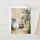 Postal de papel antiguo retro de color agua de Guay para los amantes de los piratas con barco pirata en la playa con palmeras.