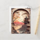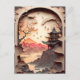 Una hermosa postal de temática marrón con una escena de corte de papel representando antiguos edificios chinos, árboles, montañas y lago.