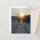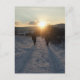 Postal Pareja caminando en la nieve al atardecer