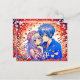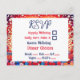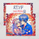 Tarjetas RSVP de boda. Niño animado y chica acurrucada rodeado de flores de colores. Una pareja de anime, un chica y un chico con el pelo azul. Los colores son rojo, azul, blanco.