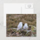 Foto original de un par de búhos de nieve sentados en un tronco de madera de deriva junto a la playa rodeados de hierba seca y flores.