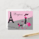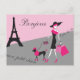 gris rosa y negro. La Torre Eiffel al fondo. Mujer vestida de moda caminando con su perro y llevando bolsas de compras. "Bonjour" y "Oh La La" arriba.