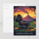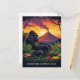 Un atardecer vibrante sobre un volcán en el Parque Nacional Volcanes, con un gorila en primer plano y exuberante follaje tropical.