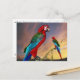 Macaws tropicales 3D vibrantes, únicos y artísticos con plumas coloridas en colores rojo, azul, verde, naranja, amarillo, blanco en naturaleza salvaje bajo el cielo rosa de la puesta de sol , creado por Bulgan Lumini (c).