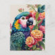 Esta postal presenta una colorida obra de arte de aves acuáticas de un loro multicolor enmarcado por una variedad de flores. Rojo, amarillo, naranja, verde, azul e incluso morado aparecen en esta vibrante obra de arte de loro floral.
