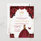 Esta elegante y glamorosa invitación a la fiesta de cumpleaños incluye una hermosa princesa con el pelo rubio en un vestido de bata rojo burdeos. El texto combina el guión manuscrito y las fuentes sans serif modernas para un aspecto elegante y sofisticado. Los arreglos florales, mariposa y confitis dorada crean la mezcla perfecta entre rústico y moda. Gráficos de www.etsy.com/uk/shop/SunflowerDayLove