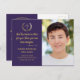 Anuncie su graduación de la escuela secundaria de 2020 a la familia y amigos con esta invitación personalizada de foto grad con temática cristiana y una postal de invitación a la fiesta. La elegante plantilla de diseño muestra tu foto con un verso de la biblia a la izquierda en una tipografía de escritura moderna que dice "Dios tiene más reservado para ti de lo que puedes imaginar". Con tu nombre, escuela, año y fecha en oro sobre un fondo morado con una corona de laurel de oro y una cruz cristiana en el centro. La parte trasera de la postal tiene más de sus detalles de graduación con la invitación de fiesta para que usted sea personalizar acentuado por una cruz cristiana. ¡Felicitaciones por tu graduación! Diseñado por la artista Susan Coffey.