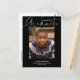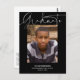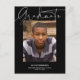 Esta minimalista postal de graduación presenta un diseño sencillo con escritura informal. En el frente, "Graduado" está escrito en caligrafía casual al otro lado de la parte superior, con una gran foto debajo. En la parte inferior, agregue el nombre del graduado, la escuela y el año de graduación. La tipografía es blanca contra un fondo negro inky. En la parte posterior de la tarjeta postal de graduación puede agregar un mensaje a los destinatarios y/o a la información de la fiesta de graduación.