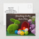 Adorable tarjeta de postal verde de Semana Santa Bunny con bolas de picnic y tulipanes morados. Personalizado de texto frontal / reverso. Campo de dirección personalizable. Si compra a granel, puede reemplazar el texto del campo de dirección por puntos o guiones o borrar completamente.