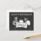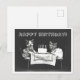 Esta postal es una reproducción de una fotografía vintage en blanco y negro que muestra a dos gatos vestidos con ropa sentados en una mesa con un pastel de cumpleaños.