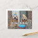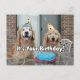 Esta tarjeta postal presenta una fotografía de dos perros retriever dorados sonrientes celebrando un cumpleaños al aire libre, completo con un pastel de cumpleaños azul. El texto personalizable en la parte posterior dice: "¡Celebremos!"