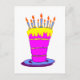 Una torta gigante de cumpleaños con helados rosados y amarillos, hielo goteando y velas azules brillantes.