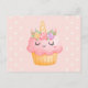 Una postal con un dibujo acuarela de un quequito con hielo rosa, un cuerno de unicornio y rosas coloridos.