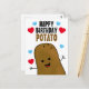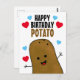 Patata marrón feliz divertida rodeada de corazones de amor rojos y azules con papa de cumpleaños feliz con letras negras y marrones encima de su cabeza.