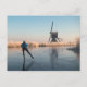 Postal de un atleta patinando sobre un río congelado pasado de cañas de hielo y un molino de viento en una hermosa mañana de invierno en los Países Bajos.