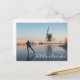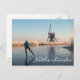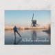 Postal de un atleta patinando sobre un río congelado pasado de cañas de ciruela y un molino de viento en una hermosa mañana de invierno en los Países Bajos con el texto: 'Países Bajos'.