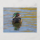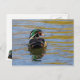 Una imagen distintiva de un pato de madera macho mientras flota sobre el agua rizada en la luz suave matutina.