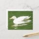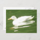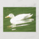Esta preciosa postal muestra una fotografía de un magnífico pato blanco de Aylesbury nadando a través de un estanque de pato en un parque. Se pueden ver las olas en el agua y el reflejo del pato.