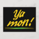 Postal divertida que muestra al jamaiquino diciendo Ya mon!. En la parte trasera de la postal está la bandera jamaiquina.