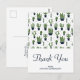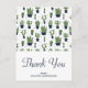 Una tarjeta postal de agradecimiento de fiesta con un sabor rústico occidental. Diseñada con un montón de cactus verdes lindos en un patrón repetitivo. Cactus de color verde sentados en una maceta de flores azul oscuro. Pequeños triángulos decorativos entre ellos. Nombre personalizado en el frente y mensaje en la parte posterior.