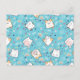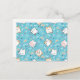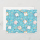 Una postal con un bonito patrón de gato, colocada en un fondo azul y decorada con arcos de lluvia, huellas de pata y más.