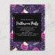 Invitación a la fiesta de Halloween con un adorable patrón temático de Halloween. Gatos con gorras brujas, sentados sobre calabazas rosas con telarañas moradas en el fondo.
