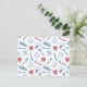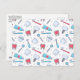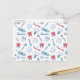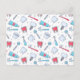 Una postal con un patrón de temática dental. Con ilustraciones coloridos de dientes, cepillos de dientes y diversas herramientas dentales.