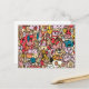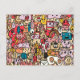 Tarjeta postal del patrón de tira de mano de caricatura. Patrón colorido con diferentes personajes divertidos y dibujados a mano. Genial para niños y adolescentes.