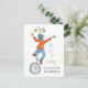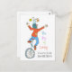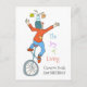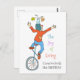 Un payaso feliz está actuando en una bicicleta de una sola rueda, equilibrando una jarra de agua en su cabeza. Hay algunas flores lindas dentro de la jarra.