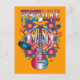 Diseño retro de Peace-Love-Music con símbolo de paz, guitarra, paloma, flores y discos de vinilo.