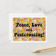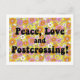 Perfecto para Postcross, esta postal cuenta con un vibrante fondo de poder floral inspirado en los años 60 y un texto en negrita que dice "¡Paz, amor y posta!" al otro lado del frente.