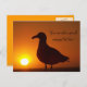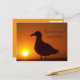 Postal con una foto que tomé de una gaviota parada mirando la puesta de sol.