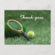 Postal de pelota de tenis y raqueta sobre hierba verde