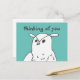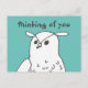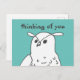 Esta tarjeta postal presenta un búho lindo que dice, "Pensando en Ti", contra un fondo verde azul. Dibujé este pequeño búho con pluma. Vea mi tienda para más regalos de búho.