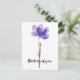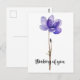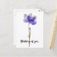 Esta tarjeta postal presenta una flor morada y las palabras, "Pensando en ti."