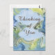 Este diseño geométrico abstracto con tonos suaves y mudos se inspira en los colores del agua en primavera. El diseño presenta el texto "Pensando en ti" con dos nubes lluviosas en contra de un diseño abstracto de agua rápida.
