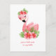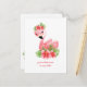 Tarjetas postales caprichosas de flamenco rosa adornadas con hermosas flores tropicales rosadas que dicen pensando en ti. Personalice con su propio mensaje en la parte frontal o déjelo como está.