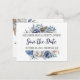 Esta hermosa tarjeta postal de 'Save the Date' es la primera que tus invitados verán de tu próxima boda. Este diseño de rosas, peonías y pampas en acuarela en azul y marfil crea un elegante anuncio para tus futuros invitados de boda.