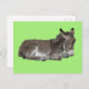 Pequeño y lindo potro de burro dormido en un brillante fondo verde. Se puede cambiar el color de fondo de la postal. Todos mis burros fueron fotografiados en el parque nacional New Forest en Hampshire, Inglaterra, donde los burros deambulan libremente junto con los ponis New Forest. Una parte encantadora del país a visitar.