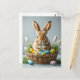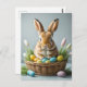 Esta súper adorable postal muestra el conejo más lindo descansando en una canasta de Pascua llena de huevos. Esta tarjeta postal de vacaciones sería ideal para amigos, familia y compañeros de trabajo.