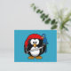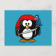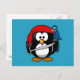 Pequeño pingüino pirata animado sobre un fondo azul.