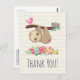 Tarjeta de agradecimiento con una ilustración de un perezoso marrón lindo colgado boca abajo. Este pequeño tipo divertido se agarra a una rama que tiene un pequeño pájaro rosa en un lado de la rama y un ramo de rosas estilo garabato en el otro lado. Debajo de ellos hay un arreglo de flores coloridas dibujadas a mano. Este adorable perezoso también tiene mejillas sonrosadas rosadas y 3 pequeños corazones lindos en su trasero. Mensaje personalizado y dirección de devolución en la parte posterior. El texto se puede eliminar si desea escribir su mensaje a mano.